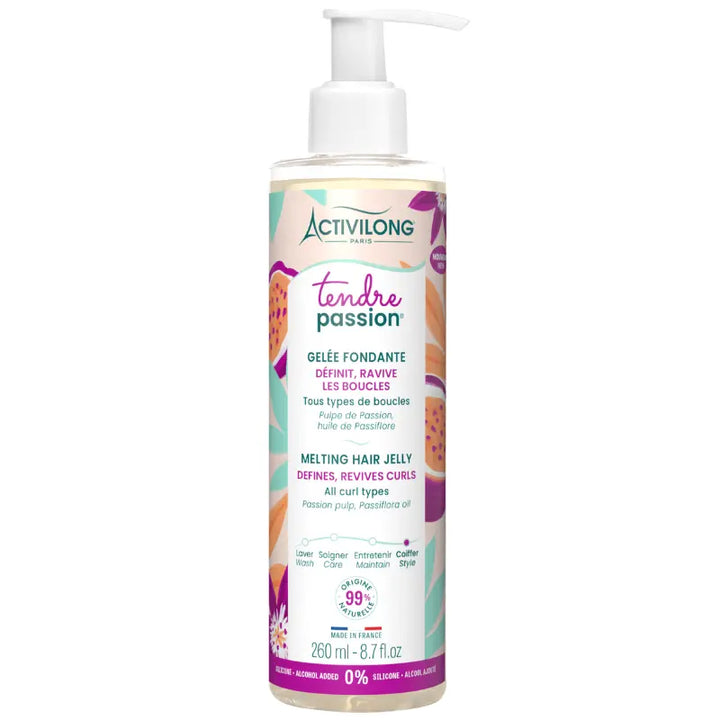 Formulée à 99 % d’ingrédients d’origine naturelle, sans alcool ajouté ni silicone, la Gelée capillaire Fondante Tendre Passion Activilong associe les bienfaits de la pulpe de passion bio – hydratant et fortifiant – à l’huile de passiflore, pour la souplesse, et à l’huile d’hibiscus, connue pour apporter de l'éclat aux cheveux ternes.
