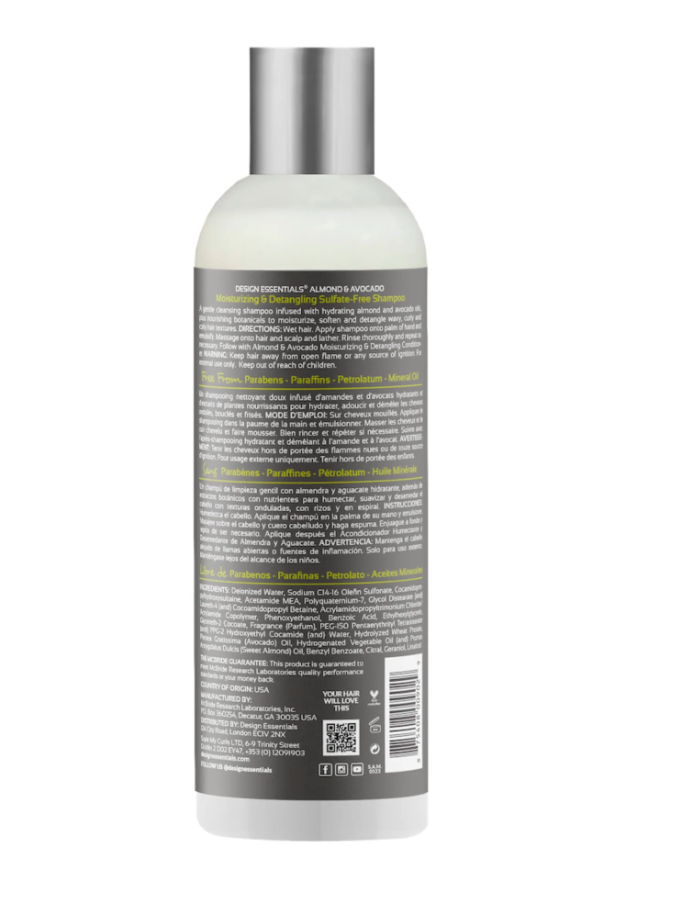 La marque professionnelle américaine Design Essentials vous propose un shampooing nettoyant doux infusé d'amande et d'avocat hydratants, ainsi que de plantes nourrissantes pour hydrater, adoucir et démêler toutes les textures.
