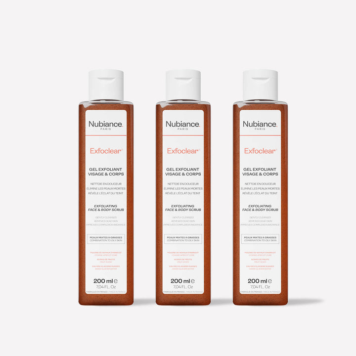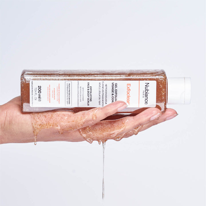 Notre gel exfoliant pour le visage et le corps Exfoclear® allie exfoliation mécanique et enzymatique au sein d'une formule douce pour la peau. Sans savon et avec un pH neutre, la poudre de noyau d'abricot affine et lisse le grain de peau. Un concentré d'acides de fruits (myrtille, érable, orange, citron et canne à sucre) désincruste les pores en profondeur, stimule le renouvellement cellulaire et la production de collagène.