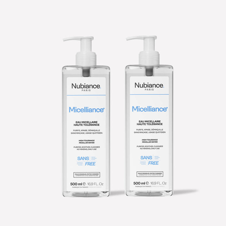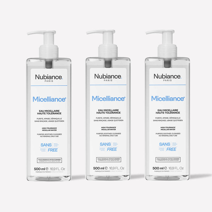 Micelliance® est une eau micellaire qui démaquille et élimine en douceur les impuretés du visage et des yeux. Elle tonifie et apaise la peau en offrant une sensation de confort immédiat. Sans alcool, sans parfum et sans colorant, Micelliance® est formulée pour minimiser les risques d’allergies et offre une grande tolérance cutanée en respectant l'équilibre naturel de la peau. Débarrassée de tout ingrédient superflu, Micelliance® vous garantit l’essentiel : une peau parfaitement nettoyée et purifiée, à l’abri des intolérances.
