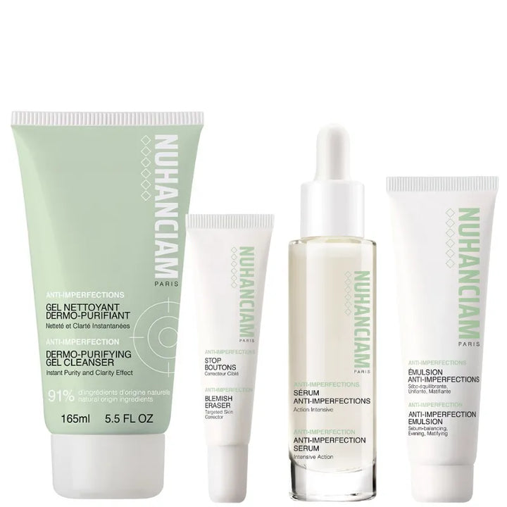 La Routine Anti-Imperfections de Nuhanciam est conçue pour les peaux sujettes à l’acné, aux points noirs, aux pores obstrués et aux taches pigmentaires.
